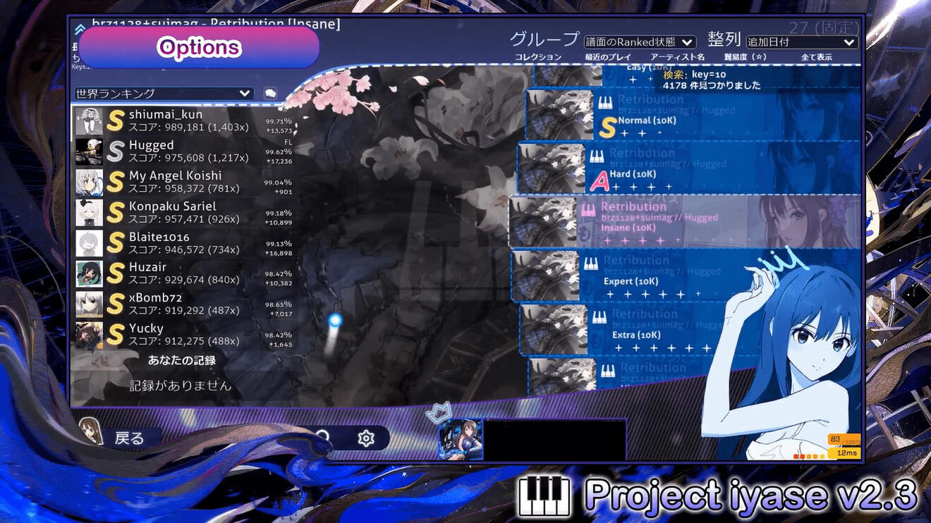 • 2024.5.30 → 1 digit (Rank #9, Top 10 Global) Soundsphere 10-Keys Leaderboard
